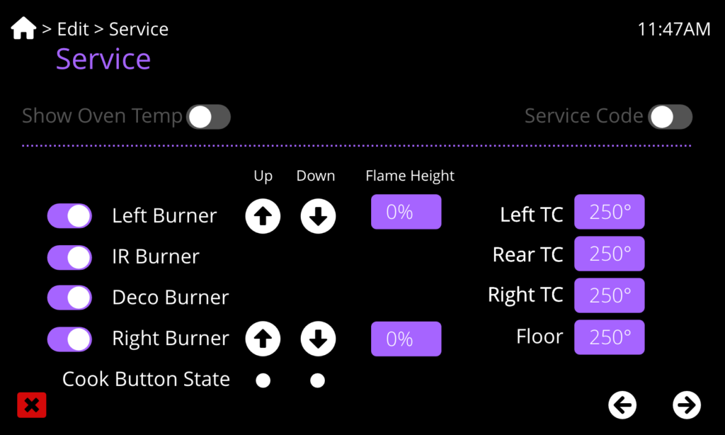- Once the oven temperature has exceeded 400F, it is acceptable to exit service mode and start a cooking profile. This will enable the IR Burner and Decorative Flame Burner (if equipped) and heat the oven up to operating temperature.
