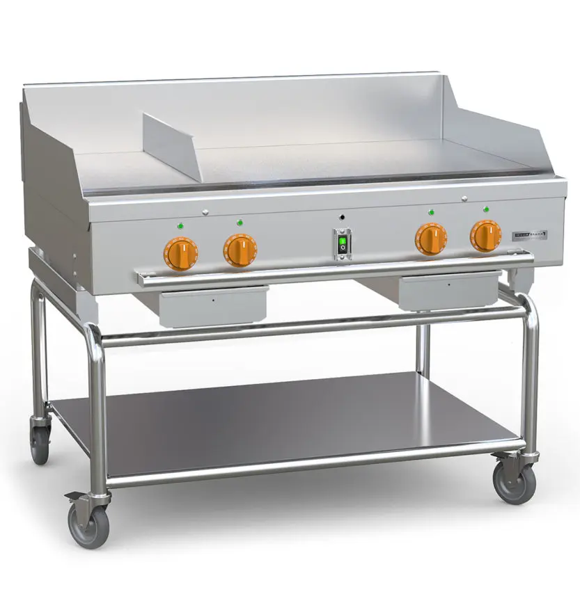 A number of optional accessories are available for our Gas Plancha line including pan rails and a rolling cart.