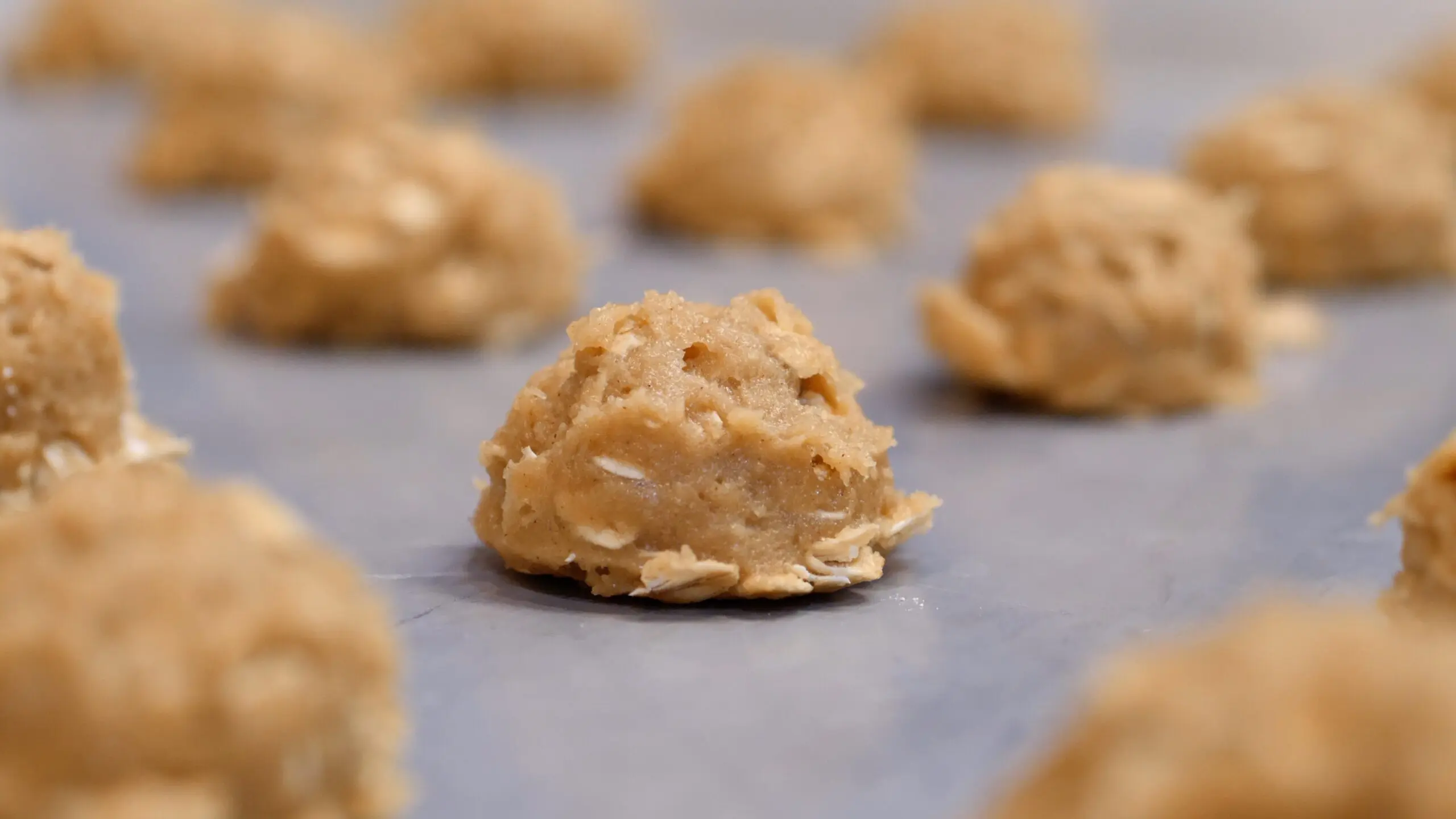 - Use a spatula to stir in the flour and oats until fully incorporated. Portion the dough right away, using a .5 oz. scoop, onto an ungreased sheet tray.