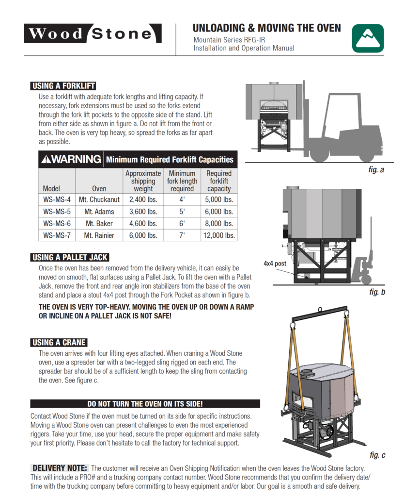 Moving a Wood Stone oven can present interesting challenges to even the most experienced riggers. Take your time, use your head, secure the proper equipment and make safety your first priority. Don’t hesitate to call the factory for technical support 24/7 at 800.988.8103. We also encourage you to visit the Installation Solutions Page for the nuisances of moving specific pieces of equipment. Note: These ovens are very top-heavy. Moving an oven up or down on a ramp via a pallet jack is not safe!