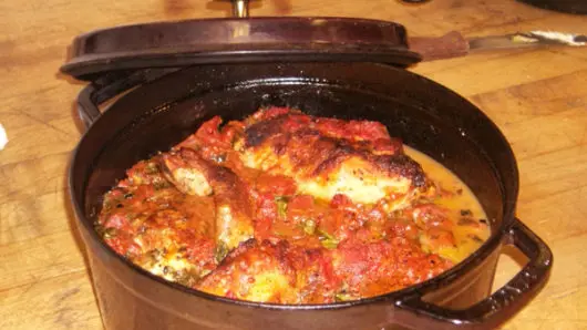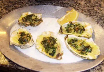 The oysters were baked with creamed spinach ala Rockafeller, but oops, we forgot to put on the bacon and breadcrumbs! They were delicious without! The second batch got the royal treatment, but the breadcrumbs browned faster than the oysters heated, so we recommend adding them halfway through the cooking.