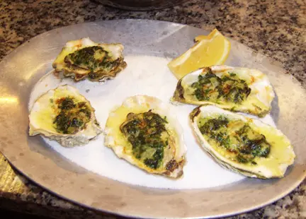 The oysters were baked with creamed spinach ala Rockafeller, but oops, we forgot to put on the bacon and breadcrumbs! They were delicious without! The second batch got the royal treatment, but the breadcrumbs browned faster than the oysters heated, so we recommend adding them halfway through the cooking.